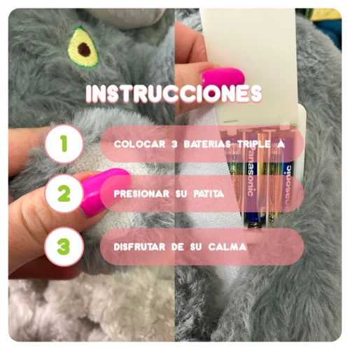 Funciona con 3 baterías AAA y está listo para acompañarte con su suavidad y ternura. Sin complicaciones, solo actívalo y disfruta de un peluche que te brinda calma y compañía en cualquier momento del día.